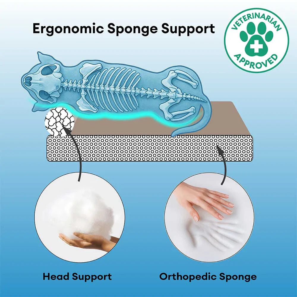 Orthopedic Support with Pillow: Filled with high-resilience sponge, this mat gently supports joints and muscles, making it ideal for senior pets, small breeds, or those recovering from injury. The matching pillow provides added neck and head support, turning every nap into a rejuvenating rest.