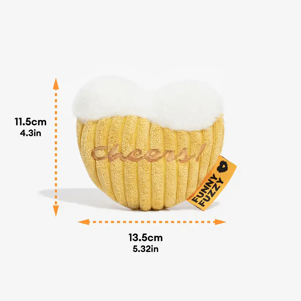 Adorable Beer Design: Shaped like a frothy pint of beer with a cheerful “Cheers” embroidery, it adds a playful and festive vibe to your pup’s toy collection.