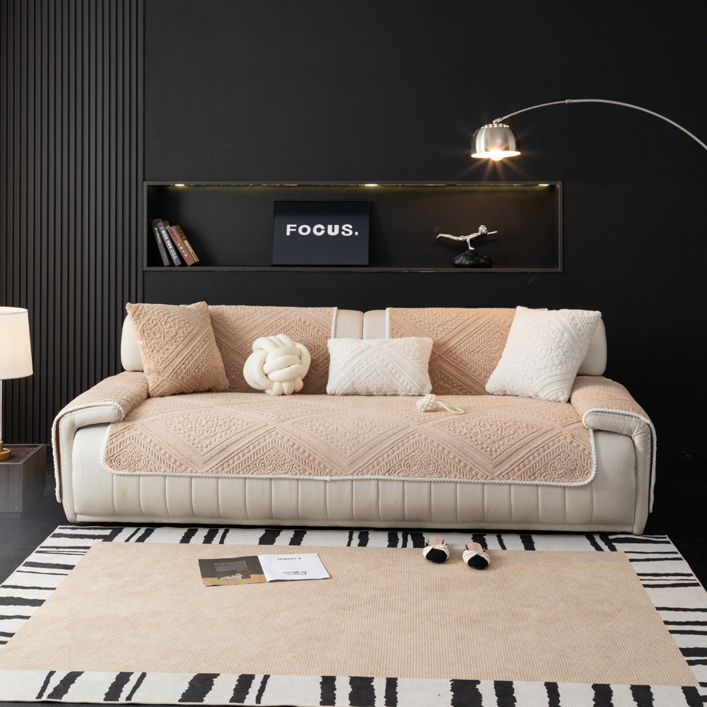 - Intricate Carved Jacquard Plush: Crafted with premium textured plush and woven in a delicate raised pattern, this cover delivers a soft, dimensional feel that elevates your sofa into a statement piece. The intricate design adds an artisanal touch—rich in texture, never flat.